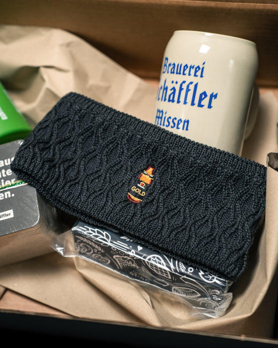 Geschenkkorb Mann: Gin, Winterstirnband (Bavarian Caps), Socken, Bierdeckel, Gaudiknopf, Steinkrug